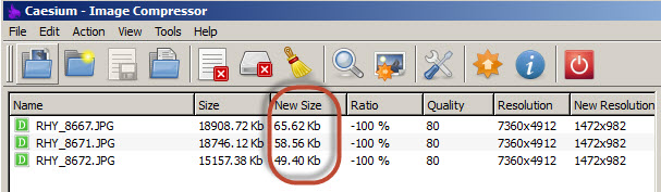 Hình dưới đây mình ví dụ với 3 hình có dung lượng rất nặng từ 15mb đến 18mb. Sau khi nén xong thì chỉ còn 49kb đến 65kb, giảm đến hơn 200% dung lượng và kích thước giảm theo mong muốn. Nhìn ở New Size và New Resolution.