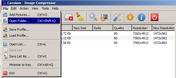 Sau khi cài đặt xong, bạn mở Caesium lên. Chọn File => Add Pictures nếu muốn thao tác 1 số hình nhất định, còn chọn Open Folder để nén tất cả hình trong folder đó.