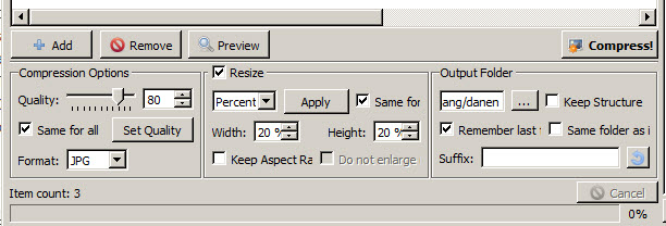 1. Tại box Compression Options và Resize đây là những thông số cần cài đặt để nén như % dung lượng giảm xuống bao nhiêu, kích thước giảm còn bao nhiêu theo tỉ lệ % (Percentage) hoặc px (Absolute). Sau khi chọn xong nhớ click Set Quality và Apply. Thông thường % dung lượng nên từ 70 đến 80. Còn kích thước thì từ 10 đến 30. Tùy vào hình ảnh bạn muốn nén đang có dung lượng và kích thước bao nhiêu. Tại box Output Folder là vị trí lưu ảnh sau khi nén. Bạn lựa chọn folder cần lưu ảnh đã nén ở đây. Nếu muốn các ảnh sau này nén cũng lưu ở folder này thì tích chọn Remember Last Folder.