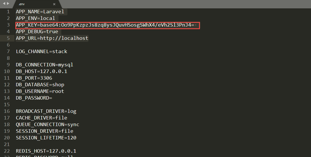 Vào thư mục shop mở file .env ta thấy nó tự động sinh mã: