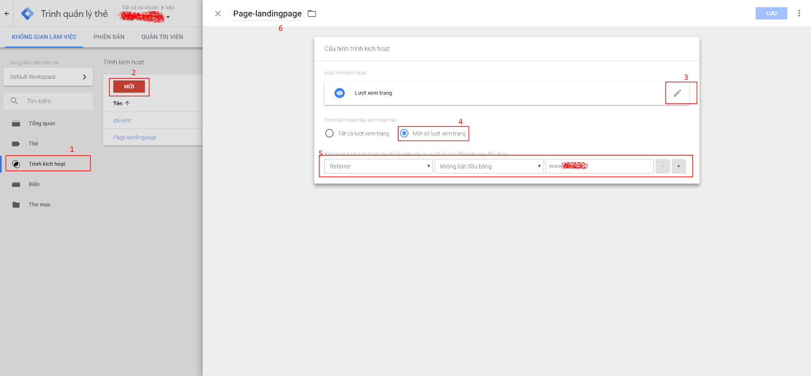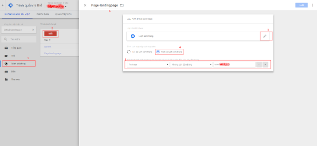 Vào Triggers (Trình kích hoạt) => Click chọn New (Mới) => Chọn vào hình bút chì => Page View (Lượt xem trang) và chọn nút Some Page View (Một số lượt xem trang) => Sau đó tùy chỉnh như hình ảnh và cuối cùng điền domain của bạn như hình bên dưới.