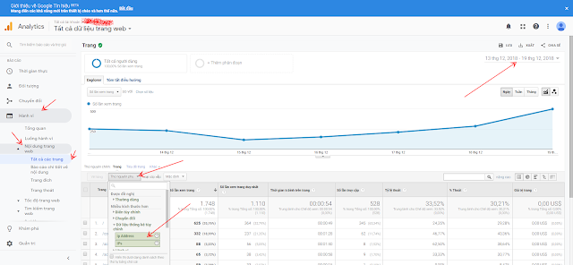 Các bạn chỉ cần truy cập vào mục HÀNH VI => Nội dung trang web => Tất cả các trang => chọn ngày => vào link cần xem => Chọn thứ nguyên phụ “ip Address”.